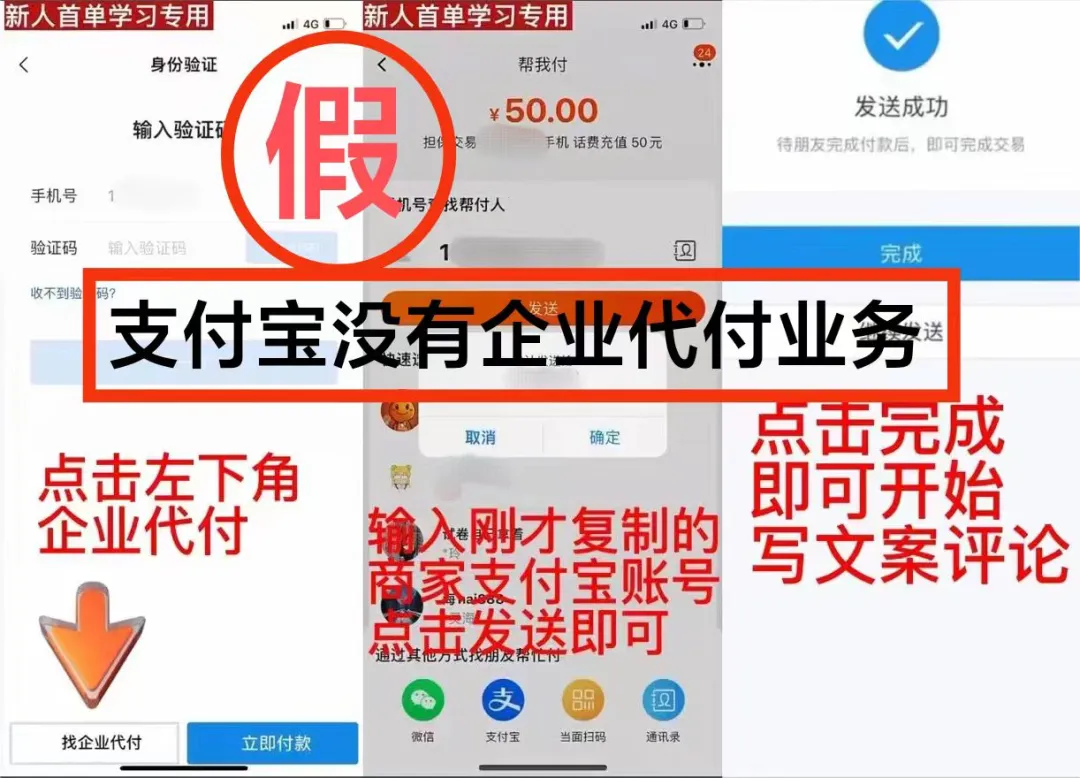 詐騙分子在網(wǎng)絡(luò)平臺大量發(fā)送“刷單兼職,無需墊付資金”的虛假廣告,吸引受害人上鉤。當(dāng)受害人主動聯(lián)系詐騙分子后,詐騙分子會聲稱“企業(yè)代付,無需受害人墊付資金,零風(fēng)險”,并發(fā)送虛假的企業(yè)代付操作流程或視頻,讓受害人信以為真。實際上支付寶并沒有企業(yè)代付業(yè)務(wù)。當(dāng)受害人按照詐騙分子所說的進行操作時,會直接扣除受害人賬戶中的資金。當(dāng)受害人要求退款時,詐騙分子利用受害人損失錢財急于追回的心理,以幫助受害人申請退款為由,讓受害人下載視頻會議軟件,并開啟屏幕共享功能,竊取受害人的銀行卡號、銀行卡密碼、短信驗證碼等信息,或誘騙受害人進一步轉(zhuǎn)賬匯款,從而騙取更多資金。