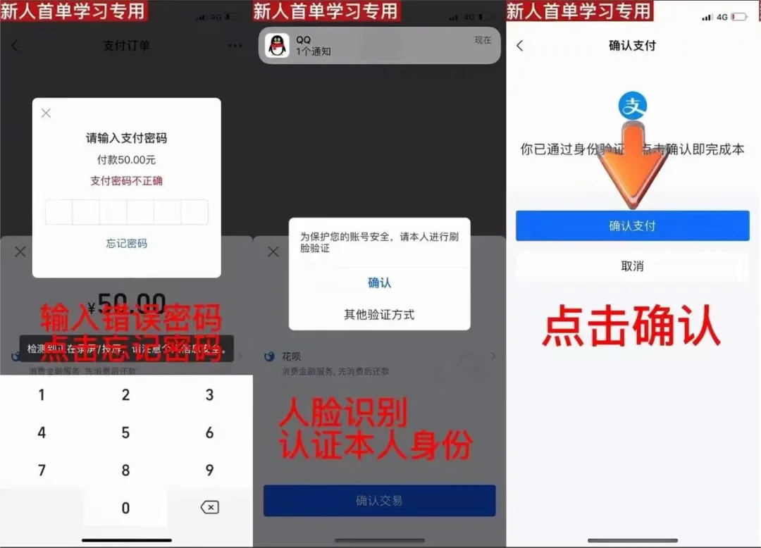 對方讓小張用支付寶購買指定的商品,在付款時,先輸入錯誤密碼,然后進入刷臉驗證環(huán)節(jié),認證本人身份后,在跳轉(zhuǎn)的頁面中點擊確認支付。
